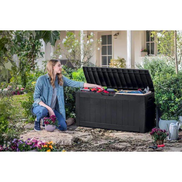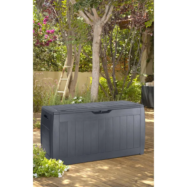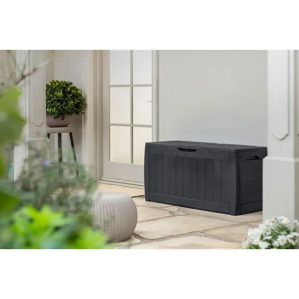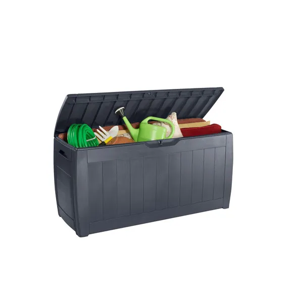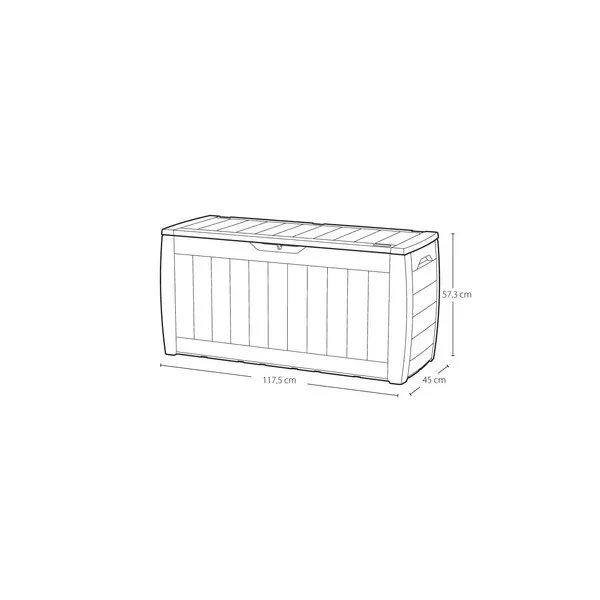 A Hollywood kerti tároló láda tökéletes kerti szerszámok és játékok tárolására, nem túl nagy mérete ellenére is. A fa textúrájú külső stílusos kinézetet kölcsönöz, tökéletesen beleillik a kert kinézetébe. A láda tartós és az időjárási viszonyoknak ellenálló szerkezetén nem fog sem a rozsda, sem a fizikai sérülés sem a penész – sok éves használat után is ugyanolyan szépen fog kinézni. Az oldalsó fogantyúk lehetővé teszik a könnyű mozgatást, a zárható fedél pedig megvédi a benne tárolt tárgyakat.