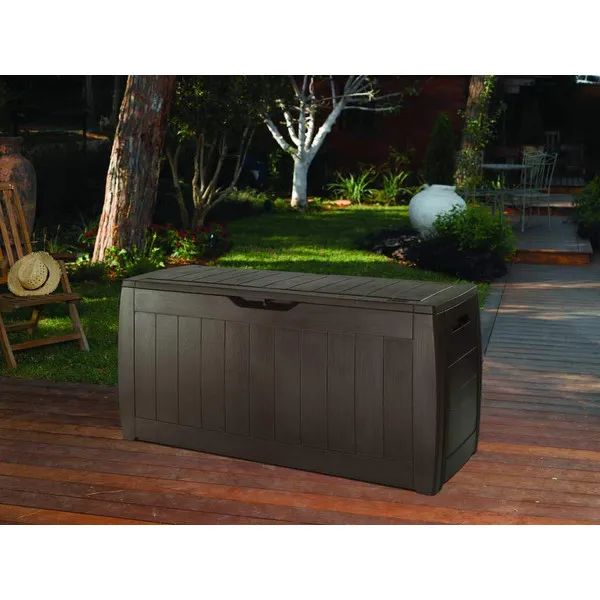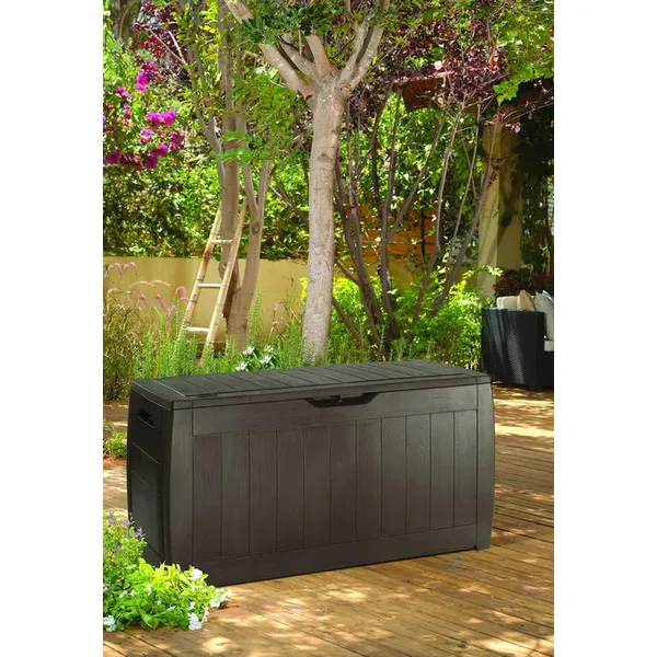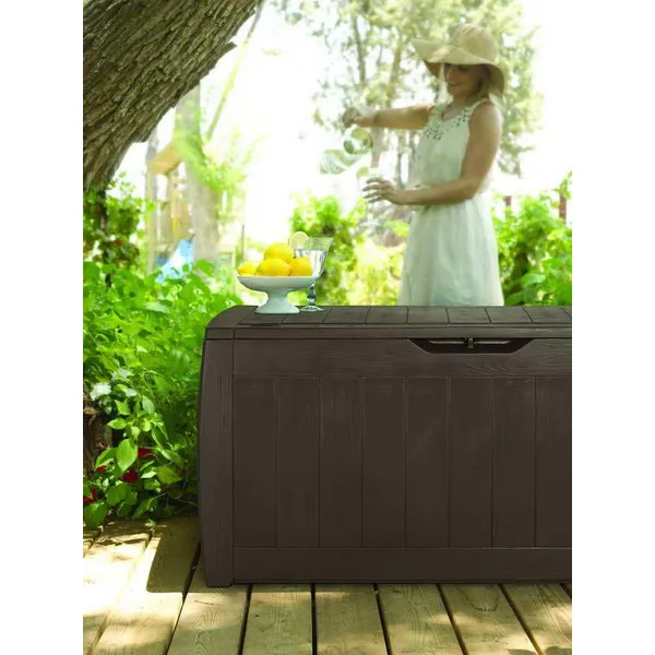 A Hollywood kerti tároló láda tökéletes kerti szerszámok és játékok tárolására, nem túl nagy mérete ellenére is. A fa textúrájú külső stílusos kinézetet kölcsönöz, tökéletesen beleillik a kert kinézetébe. A láda tartós és az időjárási viszonyoknak ellenálló szerkezetén nem fog sem a rozsda, sem a fizikai sérülés sem a penész – sok éves használat után is ugyanolyan szépen fog kinézni. Az oldalsó fogantyúk lehetővé teszik a könnyű mozgatást, a zárható fedél pedig megvédi a benne tárolt tárgyakat.