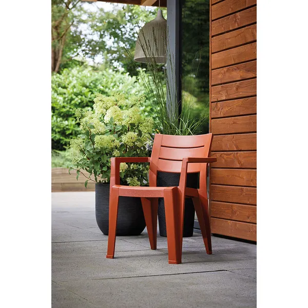 A Julie szék ergonómikus kialakításának és kartámaszainak köszönhetően maximális kényelmet nyújt, miközben egymásra rakható, így helytakarékosan tárolható. Könnyen tisztítható felülete időtálló megoldást biztosít és nem igényel karbantartást. Időjárásállóságának köszönhetően a Julie szék ellenáll a rossz időjárási körülményeknek, így beltéren és kültéren egyaránt kiválóan használható. Praktikus választás családi vacsorákhoz, baráti összejövetelekhez vagy mindennapi használatra.