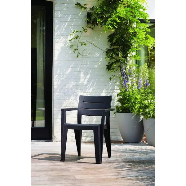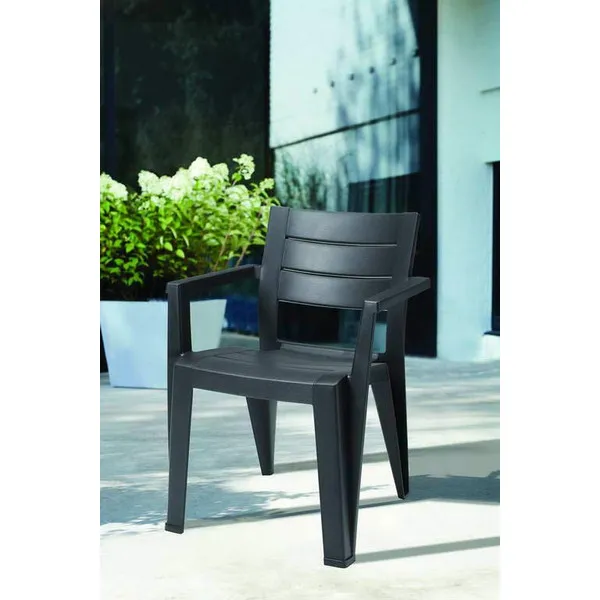 A Julie szék ergonómikus kialakításának és kartámaszainak köszönhetően maximális kényelmet nyújt, miközben egymásra rakható, így helytakarékosan tárolható. Könnyen tisztítható felülete időtálló megoldást biztosít és nem igényel karbantartást. Időjárásállóságának köszönhetően a Julie szék ellenáll a rossz időjárási körülményeknek, így beltéren és kültéren egyaránt kiválóan használható. Praktikus választás családi vacsorákhoz, baráti összejövetelekhez vagy mindennapi használatra.
