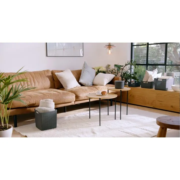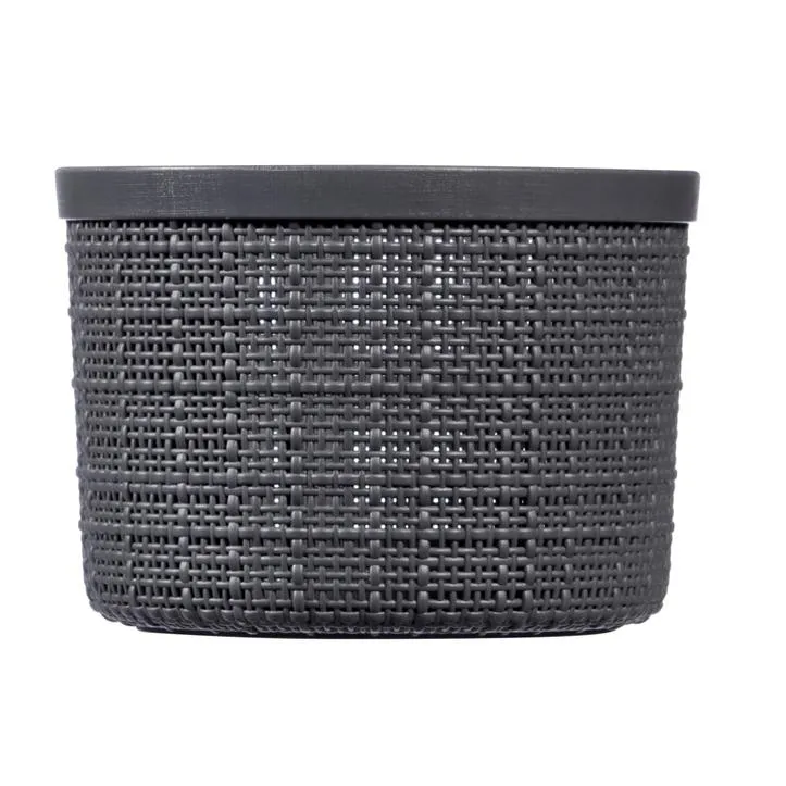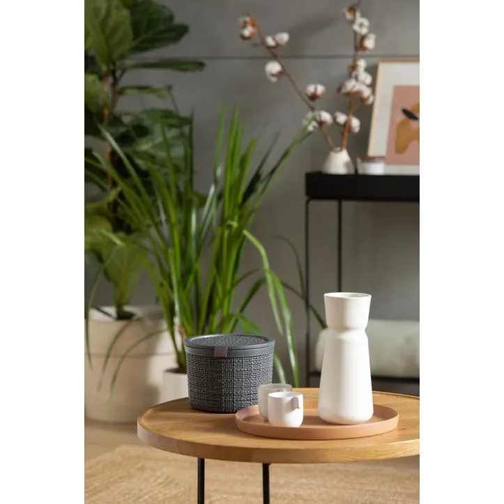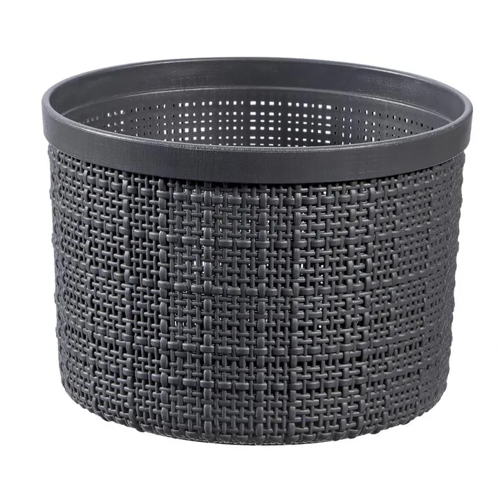 A Jute termékcsalád kerek, tetővel rendelkező kosara tökéletes választás mindenki számára, aki praktikus és stílusos otthoni rendszerezőt keres. Ez az esztétikus termék tökéletes alternatívát jelent a kozmetikumok tárolására a fürdőszobában, a konyhai kiegészítőknek, vagy akár a nappali dekorációinak. Az egyedi és különleges textúrája szőtt mintázatot imitál, ezzel kölcsönözve modern és elegáns megjelenést a kosárnak. Ennek köszönhetően a termék bármilyen stílusú belső térhez jó választás. Praktikus fogantyúinak köszönhetően rendkívül egyszerűen mozgatható, valamint a polcról is könnyedén levehető. Ha a kosarak éppen nincsenek használatban, akkor kialakításuknak köszönhetően tökéletesen egymásba tehetők, ezzel sok értékes helyet megtakarítva. A Jute kosarak 100%-ban újrahasznosított műanyagból készülnek, így teljes mértékben környezetbarátak. Anyaga könnyen tisztítható és rendkívül tartós, így éveken át jó szolgálatot fog tenni.