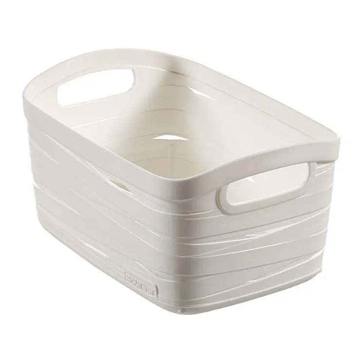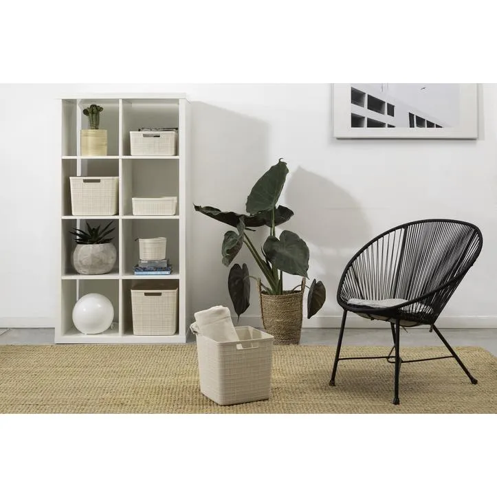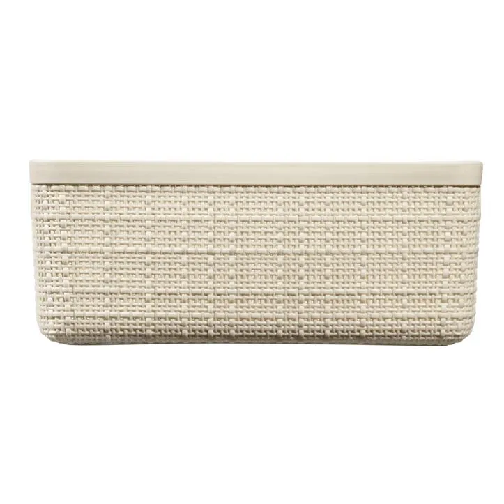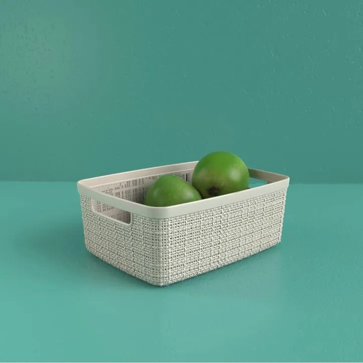 A Jute termékcsalád S-es méretű kosara tökéletes választás mindenki számára, aki praktikus és stílusos otthoni rendszerezőt keres. Ez az esztétikus termék tökéletes alternatívát jelent a kozmetikumok tárolására a fürdőszobában, a konyhai kiegészítőknek, vagy akár a nappali dekorációinak. Az egyedi és különleges textúrája szőtt mintázatot imitál, ezzel kölcsönözve modern és elegáns megjelenést a kosárnak. Ennek köszönhetően a termék bármilyen stílusú belső térhez jó választás. Praktikus fogantyúinak köszönhetően rendkívül egyszerűen mozgatható, valamint a polcról is könnyedén levehető. Ha a kosarak éppen nincsenek használatban, akkor kialakításuknak köszönhetően tökéletesen egymásba tehetők, ezzel sok értékes helyet megtakarítva. A Jute kosarak 100%-ban újrahasznosított műanyagból készülnek, így teljes mértékben környezetbarátak. Anyaga könnyen tisztítható és rendkívül tartós, így éveken át jó szolgálatot fog tenni.