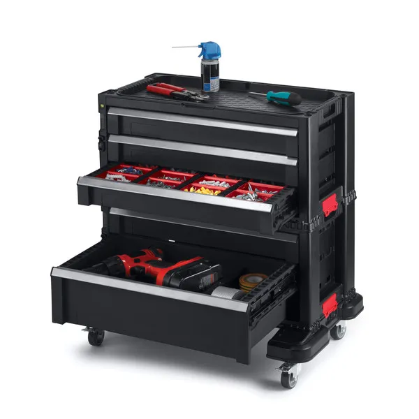 Sokoldalú, 5 fiókos kerekes tároló. Ez a tágas tároló rengeteg hellyel rendelkezik, ami tökéletes vélasztássá teszi a profik és a hobbi-barkácsolók számára egyaránt. Forgó kerekei segítségével könnyedén mozgatható a műhelyben.