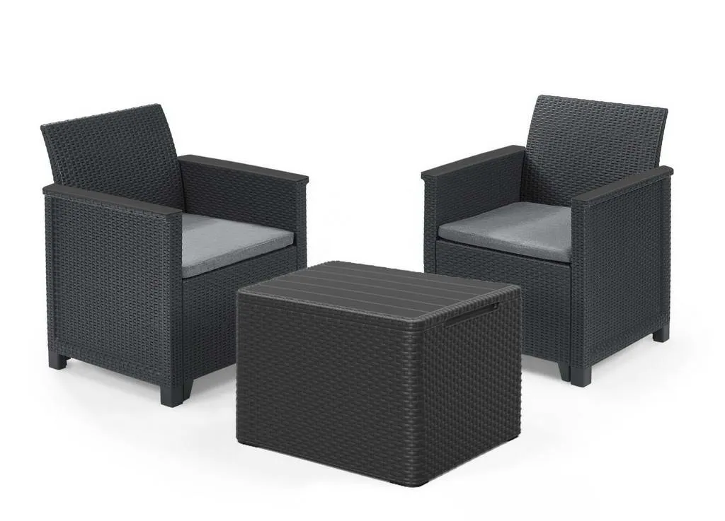 Az Elodie Balcony szett minden helyzetben jó megoldás. A segítségével berendezheted álmaid kertjét, teraszát, még akkor is ha nem nagy a rendelkezésre álló hely. A szett 2 fotelt és egy párnatartónak is használható asztalt tartalmaz. A nádfonásos és sima könyöklők valamint a rezolit asztallap kihangsúlyozzák a szett egyedi jellegét. A bútorok könnyen tisztíthatók, valamint gyorsan és egyszerűen összeszerelhetők a “just click and go” kialakításnak köszönhetően. A készlethez polietilén-pamut párnák is tartoznak.
