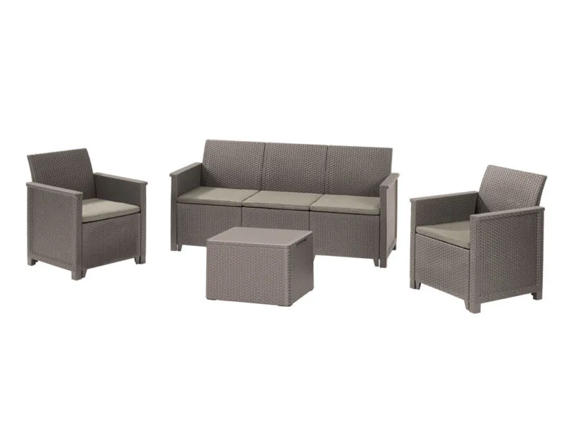 Az Elodie szett minden helyzetben jó megoldás. A segítségével berendezheted álmaid kertjét, teraszát, még akkor is, ha nem rendelkezel sok hellyel. A nádfonásos és sima könyöklők, valamint a rezolit asztallap kihangsúlyozzák a szett egyedi jellegét. Az egyedi szerkezet lehetővé teszi a választást két különböző kombináció között az összeszerelés elkezdése előtt. Az egyetlen csomagban megtalálható minden elem egy háromszemélyes kanapé, két fotel és egy tárolós asztal összeszereéséhez, de az elemekből összeállítható egy két kanapés, egy foteles és egy asztalos verzió is. A bútorok könnyen tisztíthatók, valamint gyorsan és egyszerűen összeszerelhetők a “just click and go” kialakításnak köszönhetően. A készlethez polietilén-pamut párnák is tartoznak.