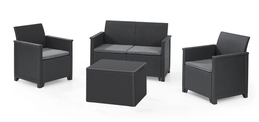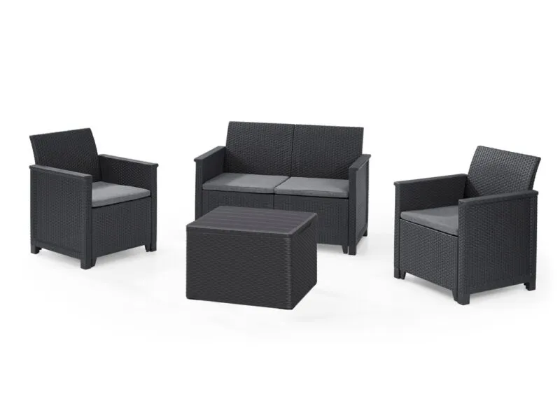 Az Elodie szett minden helyzetben jó megoldás. A segítségével berendezheted álmaid kertjét, teraszát, még akkor is ha nem nagy a rendelkezésre álló hely. A szett 2 fotelt, egy kétszeméyles kanapét és egy párnatartónak is használható asztalt tartalmaz. A nádfonásos és sima könyöklők valamint a rezolit asztallap kihangsúlyozzák a szett egyedi jellegét. A bútorok könnyen tisztíthatók, valamint gyorsan és egyszerűen összeszerelhetők a “just click and go” kialakításnak köszönhetően. A készlethez polietilén-pamut párnák is tartoznak.
