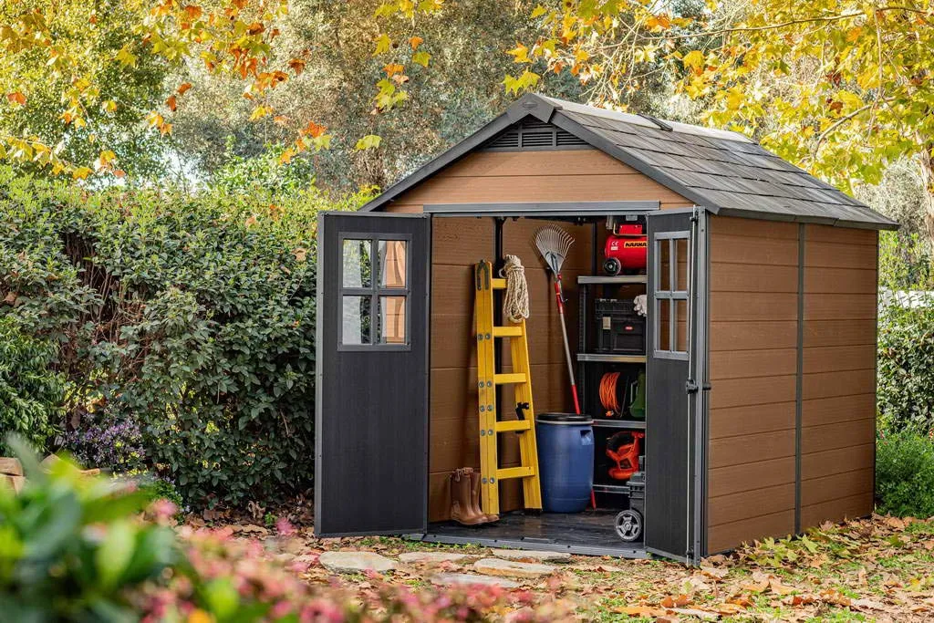 A Newton 759 szerszámos ház – az elegancia egyvelege a modern technológiával – egy kivételesen tartós kerti szerszámtároló, mely minden kert és udvar elegáns dekorációja lehet. A kifejezetten erős szerkezet és a funkcionális belső tér egész évben védelmet nyújt a szerszámok, bútorok és kerti gépek részére. A legkorszerűbb EVOTECH™+ anyagú panelekből készült, olyan kompozit anyagból, mely gyönyörű természetes fát imitáló kinézetet kölcsönöz a háznak, a felhasználónak pedig megtakarítja a festésre és karbantartásra szánt időt. A megerősített szerkezetnek köszönhetően a Newton 759 ellenáll az esőzésnek, szélnek és havazásnak. A tágas ablakok, az egész hosszban beépített fénycső és a beépített szellőző megfelelő fényt és légmozgást biztosít, a tartós padló pedig megóvja a házban tárolt eszközöket a sártól és az esővíztől.