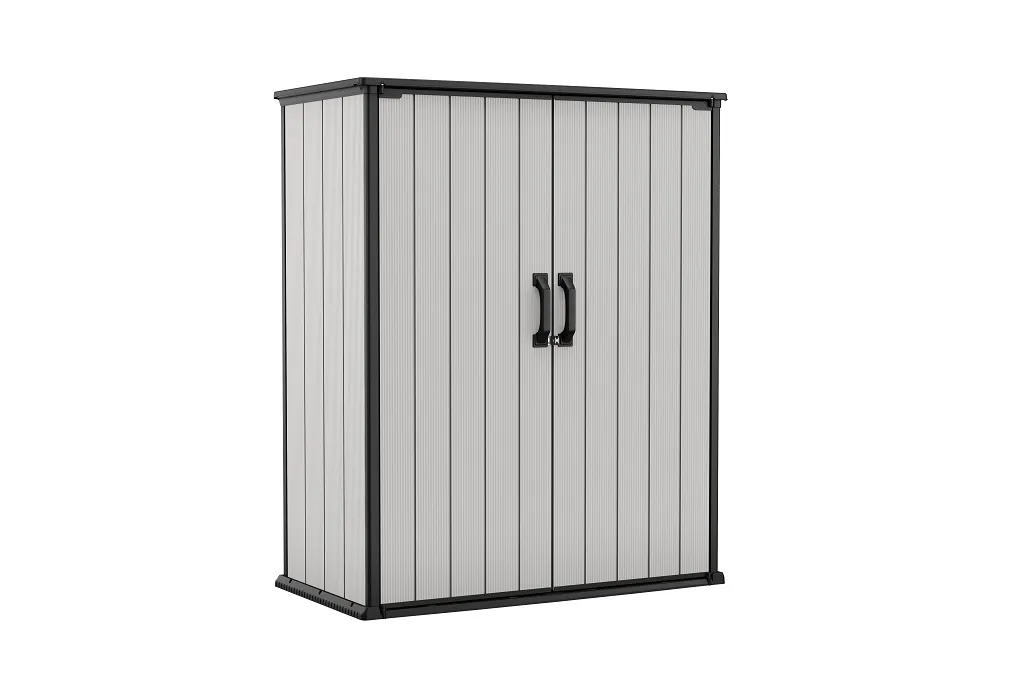 A Premier Tall szerszámos szekrény tökéletes a hosszú kerti szerszámok és más tárgyak részére, melyek méretüknél fogva nem tárolhatók máshol. Az 1500 L űrtartalmú szekrény döntött küszöbének köszönhetően ideális nehéz tárgyak tárolására is, melyeket így könnyebben be lehet tolni vagy ki lehet húzni. A beépített padlólap megvédi a tárgyakat az esővíztől és a sártól, a zárral ellátott ajtó pedig megelőzi a lopás lehetőségét éjjel és nappal. A megerősített bordázatú falak ellenállnak az időjárási körülményeknek, ezért a tároló nem igényel karbantartást.