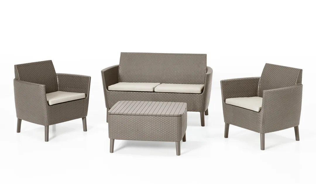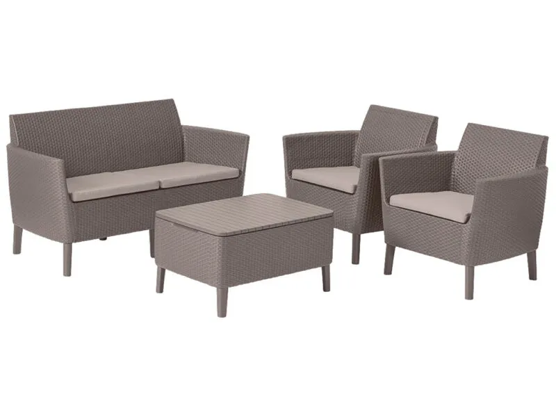 Modern dizájn, elegancia és a kényelmes használat a Salemo kerti bútor szett fő előnyei. A garnitúra egy széles, kényelmes kétszemélyes kanapét, 2 fotelt és egy tároló funkcióval rendelkező kis asztalt tartalmaz. A bútorokra jellemző az egyedi, természetes rattan fonás inspirálta felület, amely rendkívül esztétikus külsőt kölcsönöz nekik. A bútor szett tökéletesen beleillik a kertekbe, teraszokra, de akár a belterekbe is. A szett divatos színválasztékban kapható, nagyon egyszerű az összeszerelése és a karbantartása. Ellenáll a kedvezőtlen időjárási tényezők hatásának és az UV sugárzásnak is.