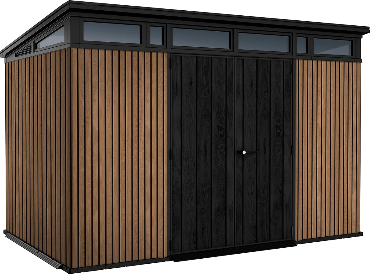 A Signature kollekció egy stílusos, modern kerti házakból álló kollekció, amely lehetővé teszi, hogy különböző textúrák és modellek közül válassz, hogy egyedi tároló megoldást alakíthass ki a kertedben. Egyikük, a rendkívül tágas PENTHOUSE 11X7 minden tekintetben modern. Az ablakok felett ferde tetővel, és számos más elegáns kialakítással büszkélkedhet, és a barkács szerszámoktól kezdve a nagyméretű kültéri sporteszközökig, motoros felszerelésekig mindent tökéletesen tárol. A PENTHOUSE 11X7 SIGNATURE COLLECTION az egyedülálló DECOCOAT technológiával készült, amely amellett, hogy időjárásálló, minden más technológiánál jobban díszíti a kültéri környezetet és megfelel a legújabb dizájn trendeknek. A DECOCOAT “Akár a valódi fa, de jobb” technológia a műanyag előnyeit kínálja esztétikus külsővel. Ez a rendkívül modern és strapabíró kerti ház teljesen időjárásálló és karbantartásmentes – nem rozsdásodik, nem szívja magába a vizet, nem válik fel a felülete