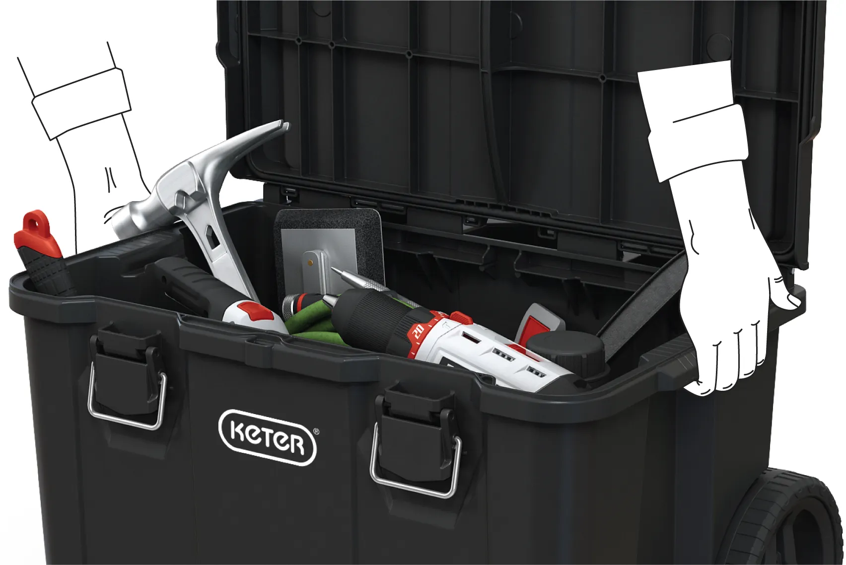 A Stack’N’Roll kerekes szerszámosláda nagy segítséget jelent a nehéz szerzámosládák, rendszerezők, vagy bármilyen nagy méretű, nehéz doboz vagy eszköz szállítása során. Ez a 7″-os kerekeken gördülő, tágas szerszámosláda oldalsó fogantyúkkal is rendelkezik, amelyek segítenek a szállításban. Teleszkópos foganytúja a tetején található gomb segítségével nyitható és csukható, kialakításának köszönhetően az ujjak becsípése nélkül. Fém csatok biztosítják a láda tetejének biztonságos záródását. Ez a kerekes szerszámosláda alkotja a gurulós szerszámosláda szett alsó részét is, amely egy rendkívül hasznos tárolási és szállítási megoldás.