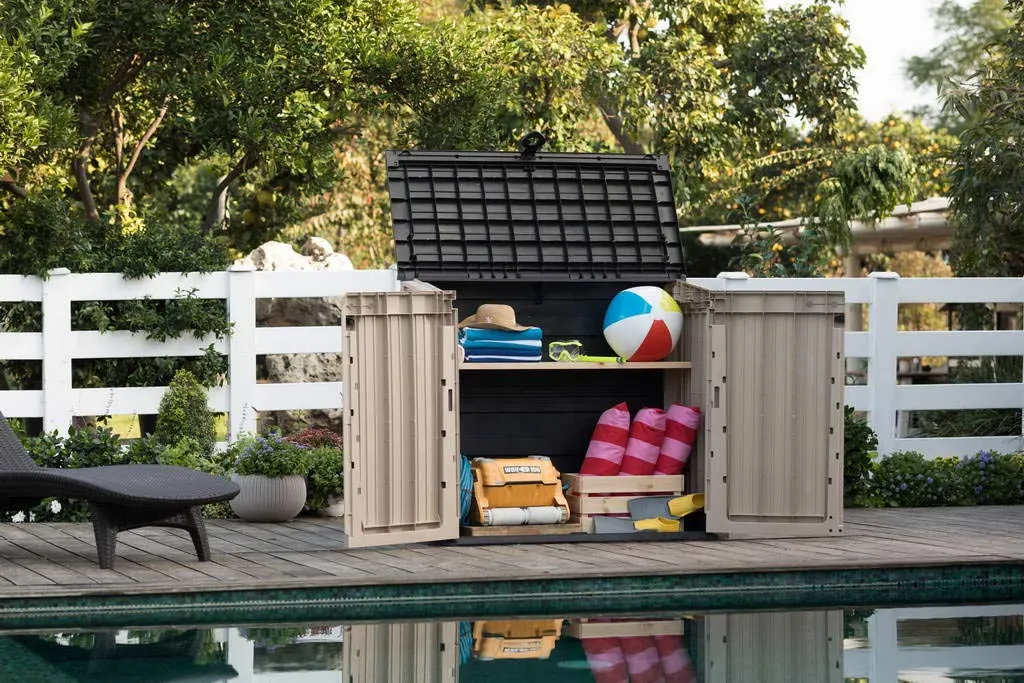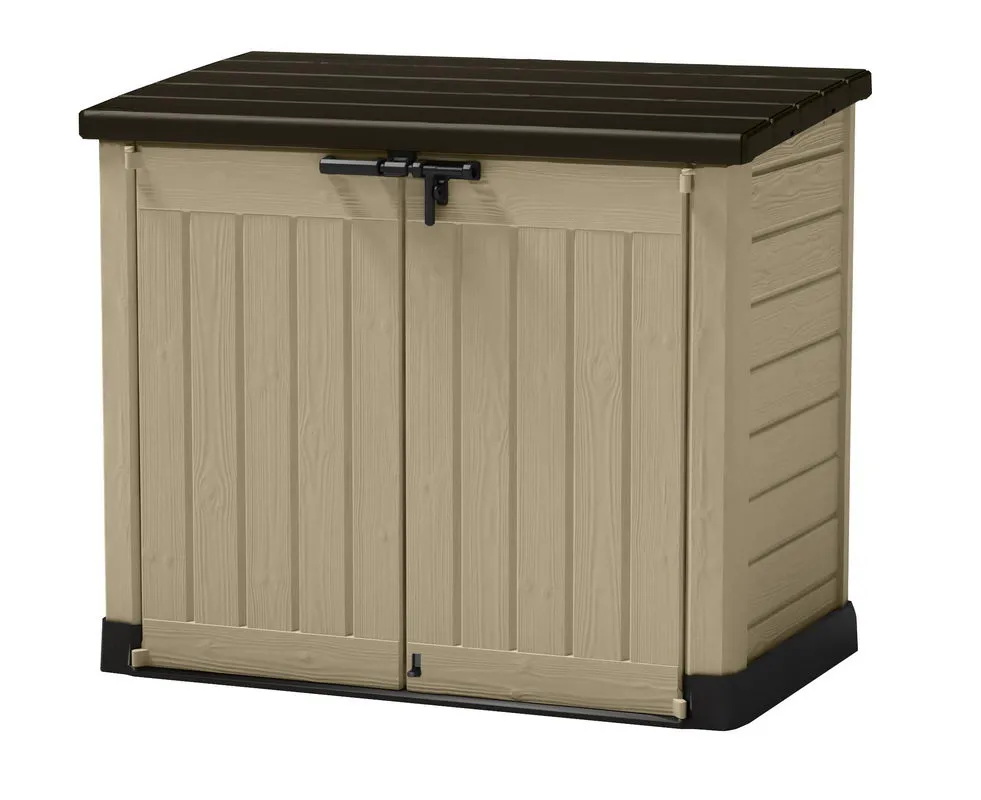 A Store It Out Midi kerti tárolót egyszerű és elegáns mintázat, univerzális színválaszték és természetes fára emlékeztető felület jellemzi. Opcionálisan polcok is beszerelhetők, melyek tovább növelik a termék használati tulajdonságait. A tároló minden olyan helyen beválik, ahol nélkülözhetetlen a kerti tartozékok és háztartási tárgyak tárolása. Az erős szerkezet megvédi a tárolóban tárolt tárgyakat a nedvességtől, a magas minőségű alapanyagok pedig hosszú élettartamot garantálnak.