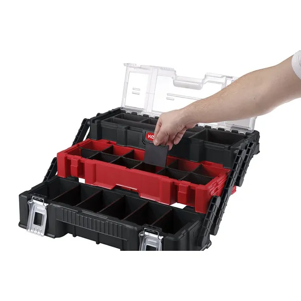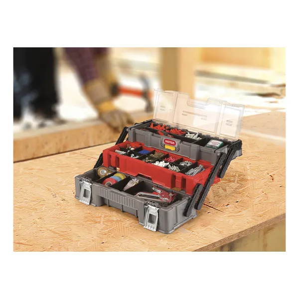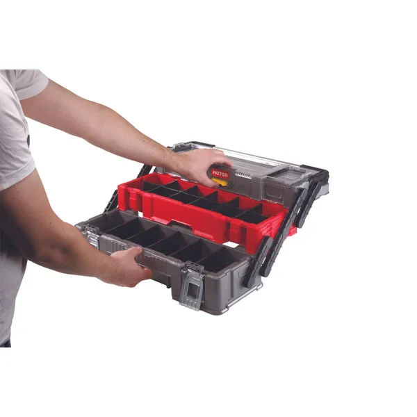 Rendszerezd az apró alkatrészeket és szerszámokat a legegyszerűbb módon a praktikus és könnyű Canti Trio szerszámosládával! Profik és hobbi-barkácsolók számára is tökéletes, szállítása egyszerű a széles, fém fogantyú segítségével. Több szintes kialakítása segít, hogy bármihez könnyedén hozzáférj, átlátszó polikarbonát tetején keresztül pedig mindig látható a felső szint tartalma. A szerszámosláda biztonságos záródásáról fém csatok gondoskodnak, így a benne tárolt eszközök mindig biztonságban lesznek.