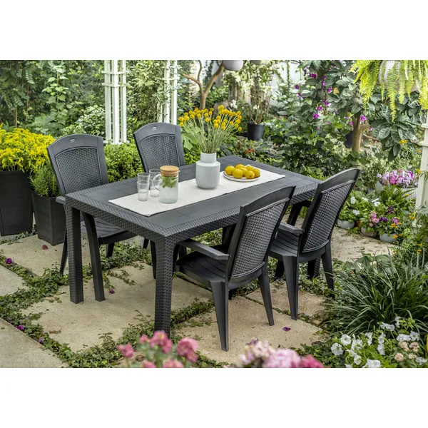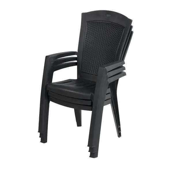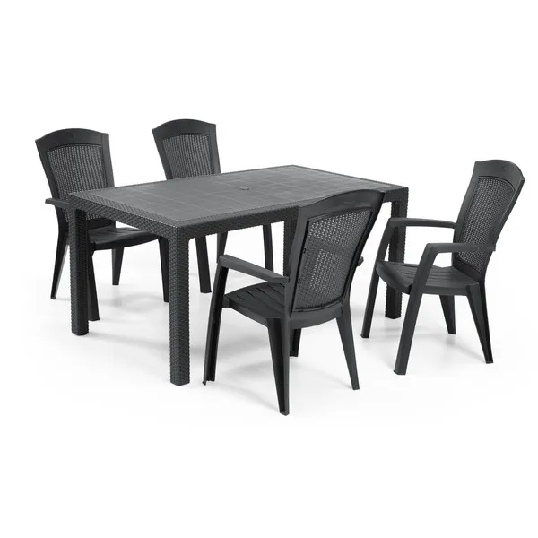 A stílusos és kényelmes Minnesota kartámaszos fotel hangulatosabbá teszi a teraszon, erkélyen vagy a kertben töltött perceket. A természetes rattan fonást imitáló, megfelelő profilú háttámla rendkívüli kényelmet biztosít. Könnyű tisztán tartani, tartós és ellenáll az időjárás viszontagságainak, valamint az UV sugárzásnak. Hagyományos színekben kapható.