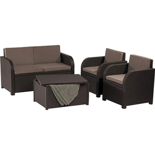 A lekerekített könyöklők tapintásban és kinézetben is kellemes hatást nyújtanak. A Modena szetthez a kényelmes, kétszemélyes kanapén és a két fotelen kívül egy tároló asztal is tartozik, amely helyet biztosít az éppen nem használt párnák, vagy kerti tartozékok tárolásához.
