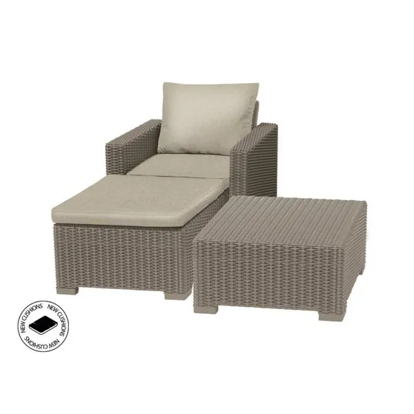A Moorea Balcony egy elegáns bútor szett, melynek mintázatát a nádfonás ihlette. A szett egy fotelből, egy lábzsámolyból és egy négyszögletes asztalból áll, melyek kellemes nyári pillanatokat garantálnak a kertben vagy a teraszon. A bútorok puha, modern színekben tündöklő párnákkal rendelkeznek. Tartósak és könnyen tisztíthatók. A bútorok hosszú távon ellenállnak időjárás viszontagságainak és az UV sugárzásnak.