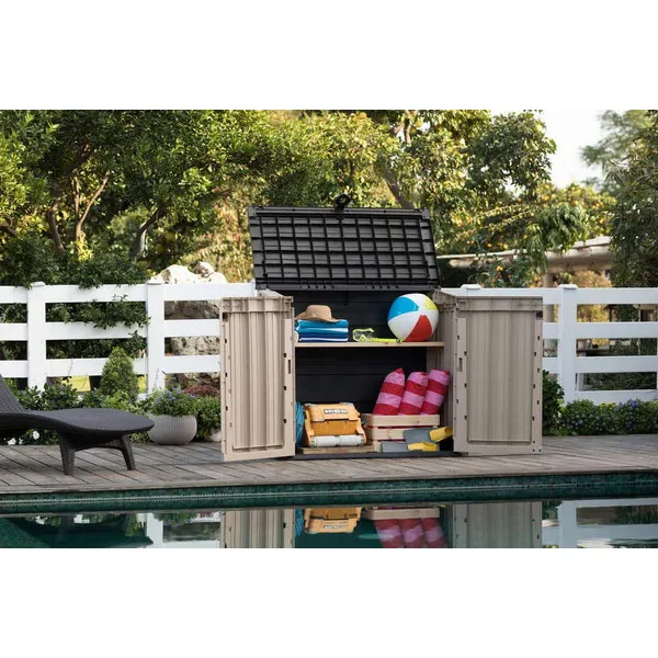 A Store It Out Midi kerti tárolót egyszerű és elegáns mintázat, univerzális színválaszték és természetes fára emlékeztető felület jellemzi. Opcionálisan polcok is beszerelhetők, melyek tovább növelik a termék használati tulajdonságait. A tároló minden olyan helyen beválik, ahol nélkülözhetetlen a kerti tartozékok és háztartási tárgyak tárolása. Az erős szerkezet megvédi a tárolóban tárolt tárgyakat a nedvességtől, a magas minőségű alapanyagok pedig hosszú élettartamot garantálnak.