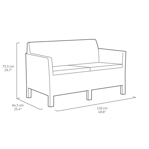 Szék ( x 2): 65 x 65 x 75 Kanapé: 126 x 65 x 75 Asztal: 59 x 59 x 43 |