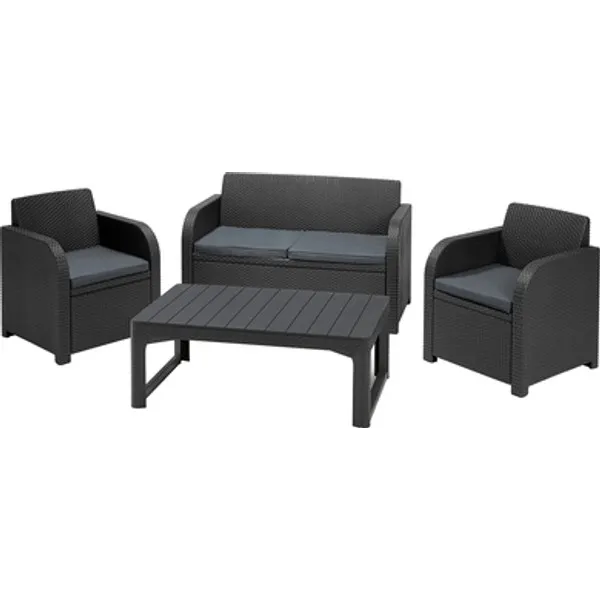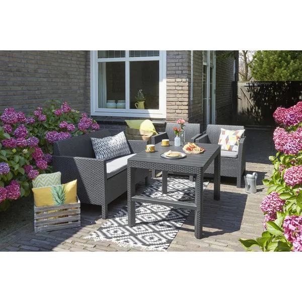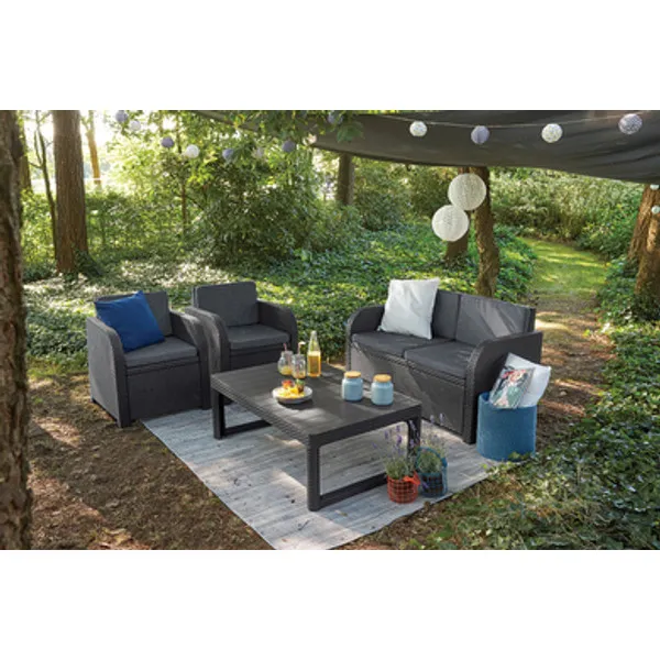 A lustálkodás a napsütésben sokkal jobban esik a kényelmes, négyszemélyes Orlando szettel. Az ergonomikusan kifejlesztett háttámlák és az ülőpárnák komfortos pihenést garantálnak. Az állítható magasságú Lyon asztal rendkívül praktikus, használható akár dohányzó-, vagy étkezőasztalként is. Alacsonyabb állásban az asztalra rágcsálnivalókat és italokat helyezhetünk, ebédidőben pedig elég megemelni a lábakat az optimális magasság beállításához. Nem kell választani az étkező és a pihenő szett között, így az Orlando tökéletes megoldás lehet kisebb kertekben és teraszokon.