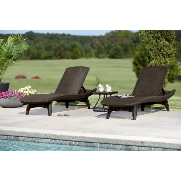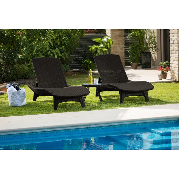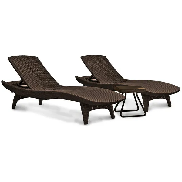 Elegáns napozóágy garnitúra két stílusos nyugággyal és egy kompakt kisasztallal, amelyre ráhelyezheti a frissítő italokat vagy akár az olvasnivalót is. A garnitúrát egyedi mintázat és forma, valamint stabil szerkezet jellemzi. A nyugágyak kényelmes, dönthető háttámlái maximális kényelmet biztosítanak a kertben. A termék fontos jellemzője, hogy ellenáll az időjárás viszontagságainak és az UV sugárzásnak. Könnyű tisztán tartani.