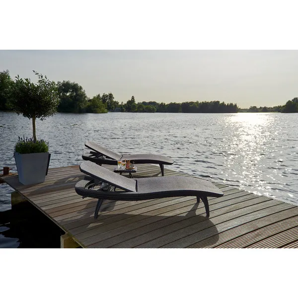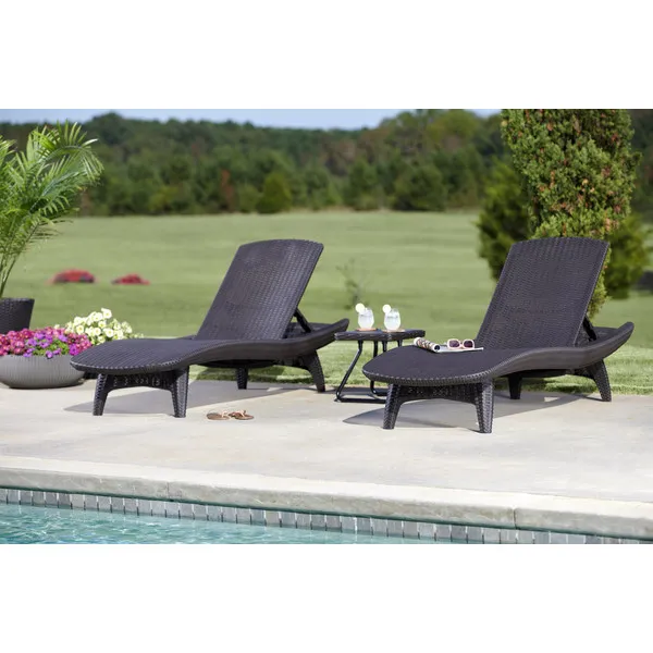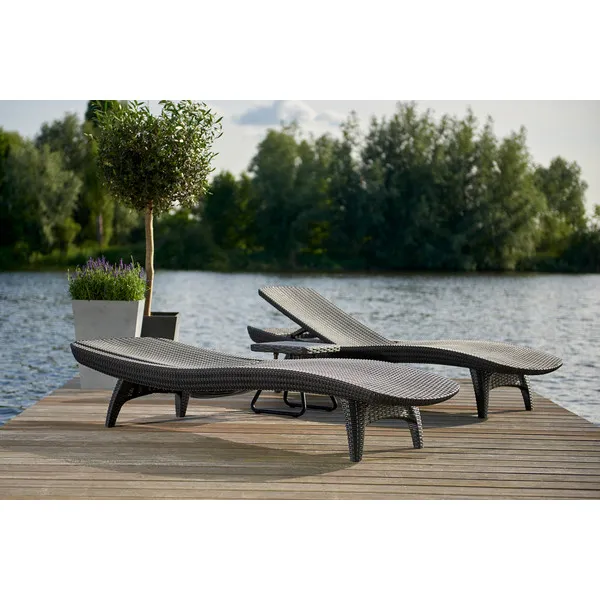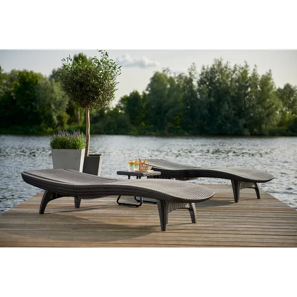 Elegáns napozóágy garnitúra két stílusos nyugággyal és egy kompakt kisasztallal, amelyre ráhelyezheti a frissítő italokat vagy akár az olvasnivalót is. A garnitúrát egyedi mintázat és forma, valamint stabil szerkezet jellemzi. A nyugágyak kényelmes, dönthető háttámlái maximális kényelmet biztosítanak a kertben. A termék fontos jellemzője, hogy ellenáll az időjárás viszontagságainak és az UV sugárzásnak. Könnyű tisztán tartani.