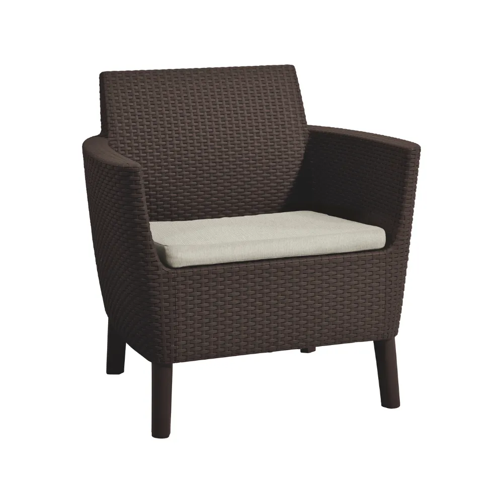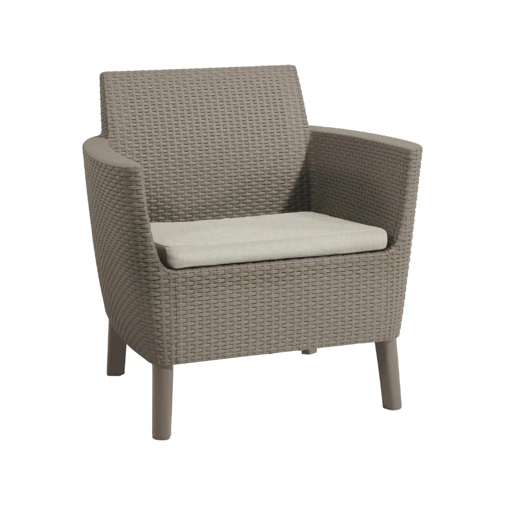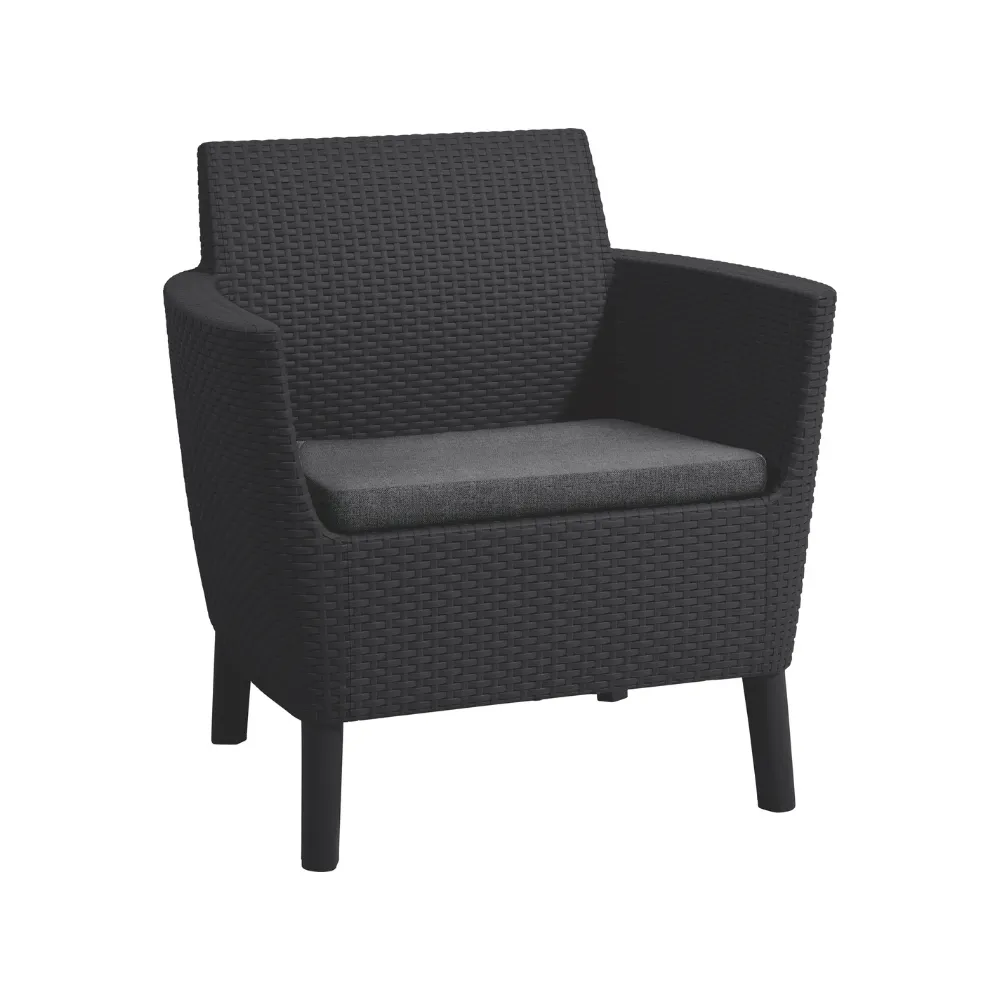 Korszerű, áramvonalas forma, komfortérzet és kiváló minőség. Mindezek a Salemo Duo előnyei. A szett két tágas fotelból áll, melyek a Salemo termékcsalád más bútoraihoz is tökéletesen passzolnak. A természetes nádfonást imitáló textúra növeli a termékek esztétikai értékét. A bútorok könnyen tisztíthatók, összeszerelésük egyszerű, ezenfelül ellenállnak az időjárás viszontagságainak.