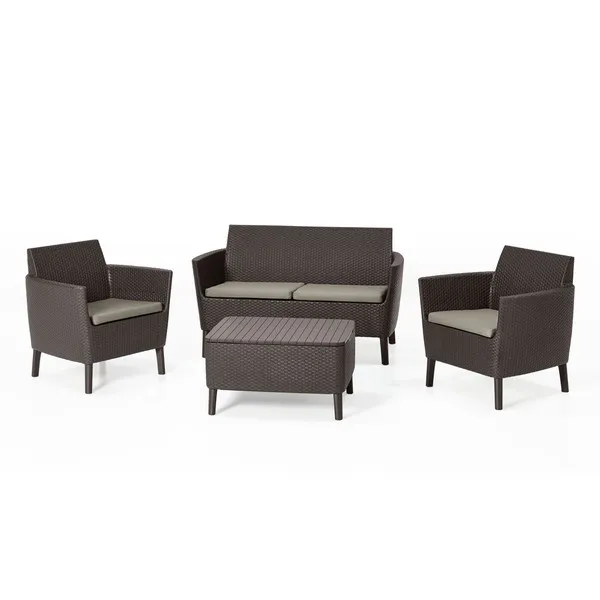 Modern dizájn, elegancia és a kényelmes használat a Salemo kerti bútor szett fő előnyei. A garnitúra egy széles, kényelmes kétszemélyes kanapét, 2 fotelt és egy tároló funkcióval rendelkező kis asztalt tartalmaz. A bútorokra jellemző az egyedi, természetes rattan fonás inspirálta felület, amely rendkívül esztétikus külsőt kölcsönöz nekik. A bútor szett tökéletesen beleillik a kertekbe, teraszokra, de akár a belterekbe is. A szett divatos színválasztékban kapható, nagyon egyszerű az összeszerelése és a karbantartása. Ellenáll a kedvezőtlen időjárási tényezők hatásának és az UV sugárzásnak is.