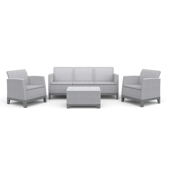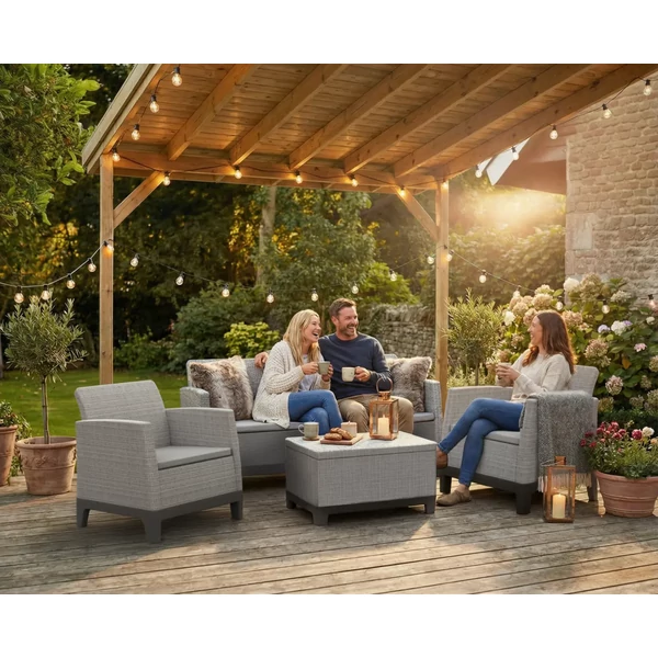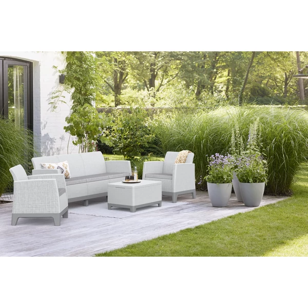 A szett két kényelmes fotelt, egy háromszemélyes kanapét és egy praktikus tárolóhellyel ellátott asztalt tartalmaz – egy olyan szettet, amely megkönnyíti a dolgok rendszerezését, és kellemes helyet teremt a kikapcsolódásra a szabadban.