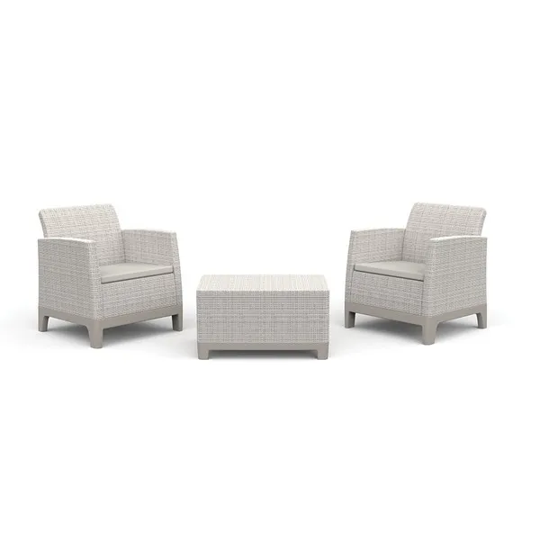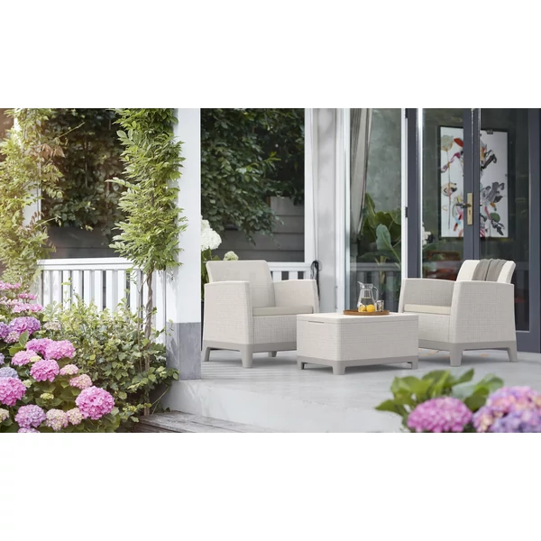 A szett két kényelmes fotelt és egy tárolóhellyel ellátott asztalt tartalmaz, így egy egységes és kényelmes garnitúrát hoz létre, amely elősegíti a rendet és biztosítja a kényelmes kültéri kikapcsolódást.