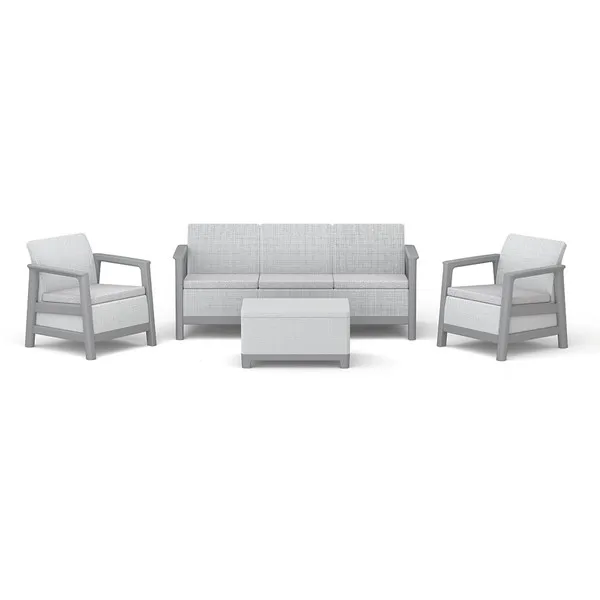 A szett két kényelmes fotelt, egy háromszemélyes kanapét és egy praktikus asztalt tartalmaz, további tárolóhellyel – tökéletes a dolgok rendszerezéséhez és a legfontosabb kiegészítők kéznél tartásához pihenés közben.