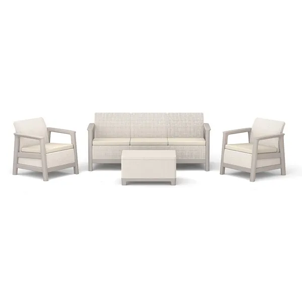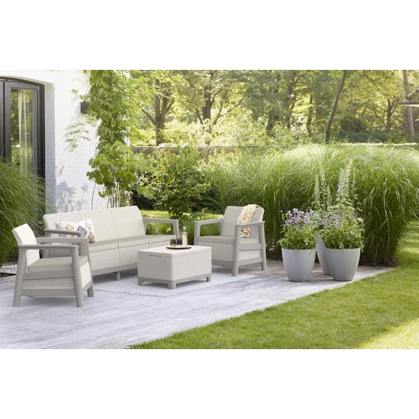 A szett két kényelmes fotelt, egy háromszemélyes kanapét és egy praktikus asztalt tartalmaz, további tárolóhellyel – tökéletes a dolgok rendszerezéséhez és a legfontosabb kiegészítők kéznél tartásához pihenés közben.