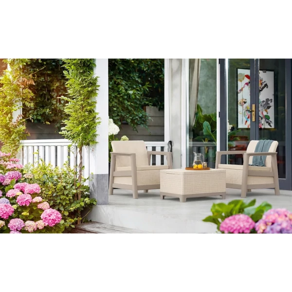 A szett két kényelmes fotelt, egy kétszemélyes kanapét és egy funkcionális asztalt tartalmaz, további tárolóhellyel – tökéletes a dolgok rendszerezéséhez és a legfontosabb kiegészítők kéznél tartásához pihenés közben.