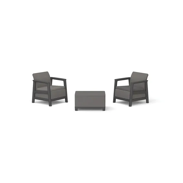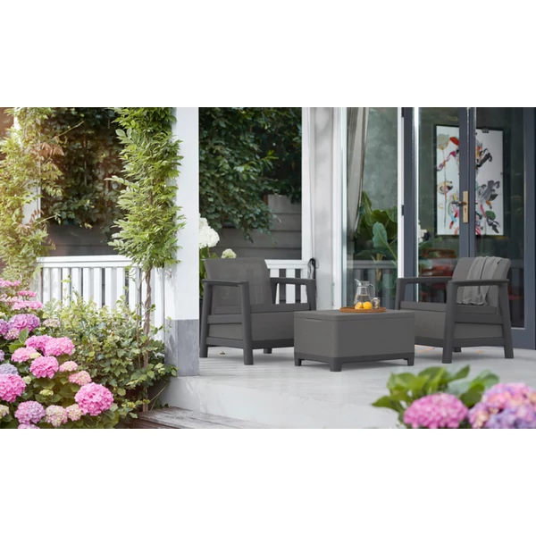 A garnitúra két kényelmes fotelt és egy funkcionális asztalt tartalmaz, további tárolóhellyel – tökéletes a rend fenntartásához és a legfontosabb kiegészítők kéznél tartásához pihenés közben.