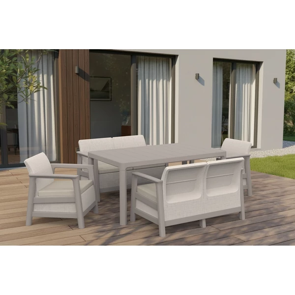 A szett két kétszemélyes kanapét, két kényelmes fotelt és egy tágas étkezőasztalt tartalmaz – egy olyan szett, amely ötvözi a nappali és az étkező funkciókat, így kényelmes, stílusos helyet teremtve a közös időtöltéshez a szabadban.
