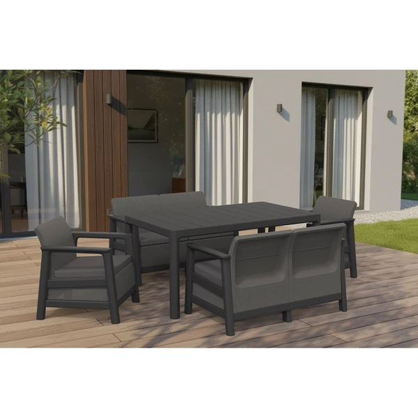 A szett két kétszemélyes kanapét, két kényelmes fotelt és egy tágas étkezőasztalt tartalmaz – egy olyan szett, amely ötvözi a nappali és az étkező funkciókat, így kényelmes, stílusos helyet teremtve a közös időtöltéshez a szabadban.