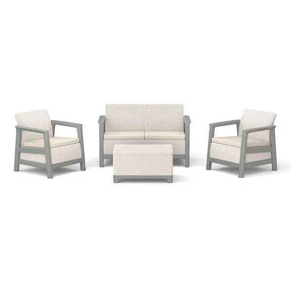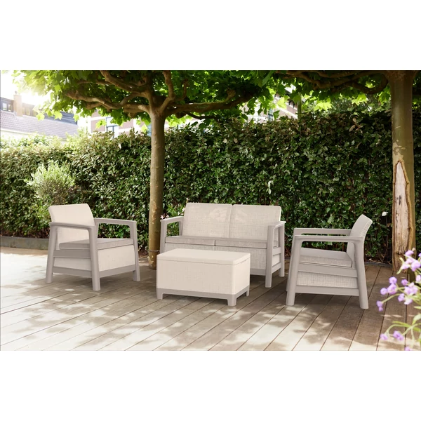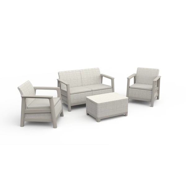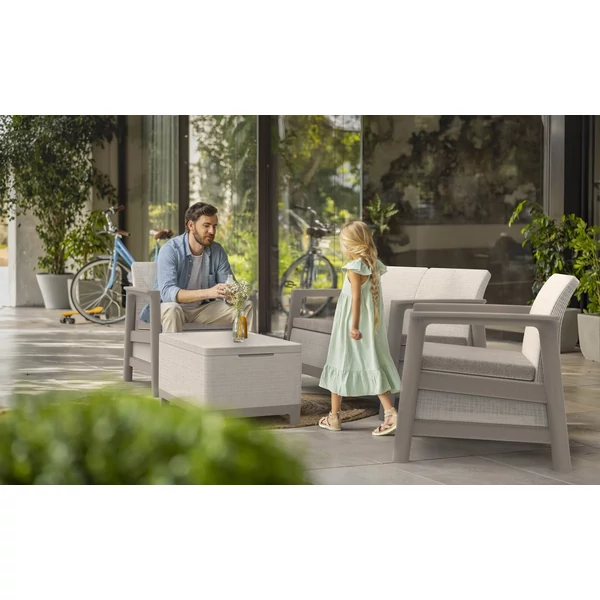 A szett két kényelmes fotelt, egy kétszemélyes kanapét és egy funkcionális asztalt tartalmaz, további tárolóhellyel – tökéletes a dolgok rendszerezéséhez és a legfontosabb kiegészítők kéznél tartásához pihenés közben.