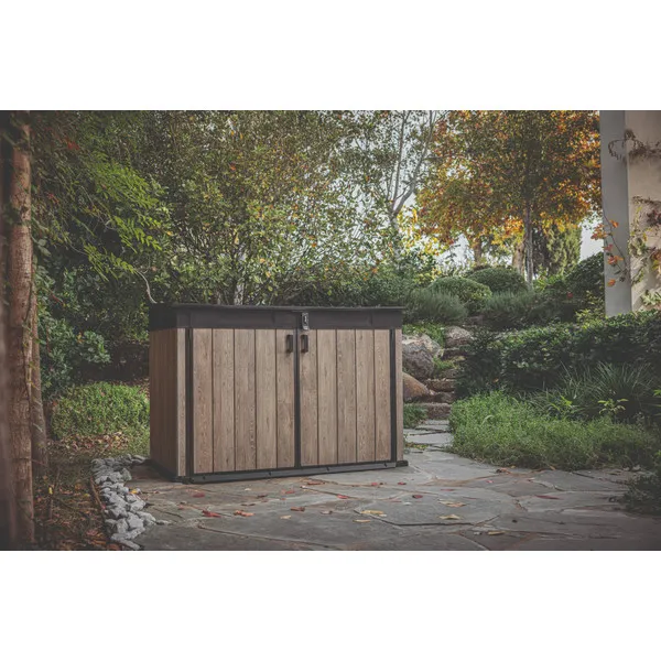 Élvezze a kényelmet a zöldövezetben az extra nagy kültéri tároló megoldással. A Horizontal Shed 2020 L innovatív DECOCOAT technológiával készült, amely minden időjárási körülménynek ellenáll. A legnagyobb kényelem érdekében a Horizontal Shed lejtős küszöbével könnyedén manőverezhető. A hidraulikus dugattyúk és a rozsdamentes fém 180°-os zsanér könnyű nyitást biztosít. Ezen felül állítható konzolok támasztják alá a fa polcot, így testreszabható tárolási lehetőségeket biztosítva. A zárható ajtók további biztonságot nyújtanak, míg a beépített szellőzőrendszer megakadályozza a kellemetlen szagok felhalmozódását. A tárolóhely két 360 literes vagy három 240 literes szemetesládának elegendő.