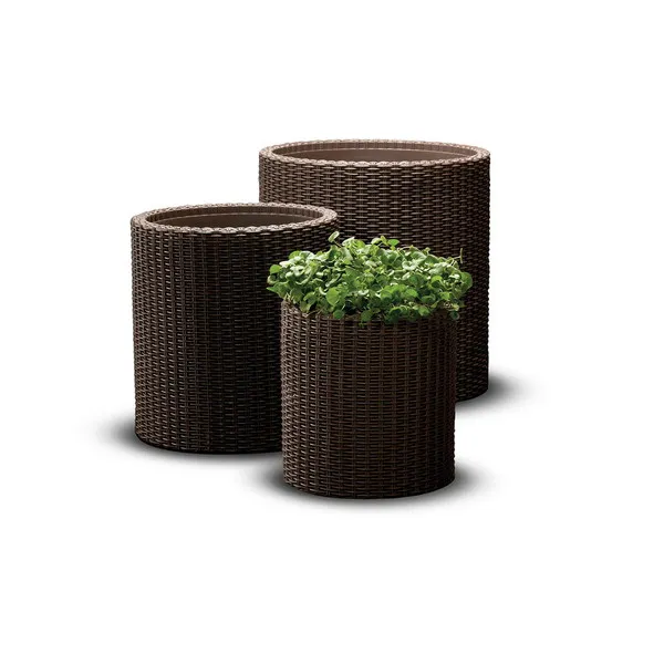 A Cylinder Planter kaspó szett egy három virágtartóból álló szett hagyományos stílusban. A természetes rattan fonást hűen imitáló felület minden kertbe passzol, kiválóan illeszkedik annak stílusához. Ideális a kúszónövényekhez de a hagyományos növény kompozíciókhoz is. A gyártáshoz használt magas minőségű műanyagoknak köszönhetően a virágtartók ellenállnak az időjárás viszontagságainak. A beépített, felesleges vizet elvezető elfolyónyílás a termék további előnyét képezi. A szett egy kicsi, egy közepes és egy nagy méretű Cylinder Planter virágtartóból áll.