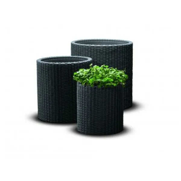 A Cylinder Planter kaspó szett egy három virágtartóból álló szett hagyományos stílusban. A természetes rattan fonást hűen imitáló felület minden kertbe passzol, kiválóan illeszkedik annak stílusához. Ideális a kúszónövényekhez de a hagyományos növény kompozíciókhoz is. A gyártáshoz használt magas minőségű műanyagoknak köszönhetően a virágtartók ellenállnak az időjárás viszontagságainak. A beépített, felesleges vizet elvezető elfolyónyílás a termék további előnyét képezi. A szett egy kicsi, egy közepes és egy nagy méretű Cylinder Planter virágtartóból áll.