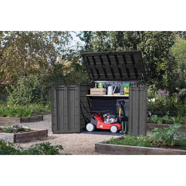Store-It-Out Max egy praktikus tároló, amely megkönnyíti a rend fenntartását a teraszon vagy a kertben. Kiválóan alkalmas kerti eszközök, grill, szerszámok, talicskák, kisebb bútorok vagy szezonális kiegészítők tárolására. Ötvözi az anyag tartósságát a természetes fa struktúrájú elegáns kivitelezéssel. Ennek köszönhetően hosszú ideig megőrzi esztétikus megjelenését és nem igényel karbantartást. A billenő fedél és a dupla ajtók kényelmes hozzáférést biztosítanak a belső térhez, a lekerekített küszöb pedig megkönnyíti a nagyobb tárgyak behelyezését. A masszív szerkezet stabilitást és hosszú távú használatot garantál, az esővel, nedvességgel és UV-sugárzással szembeni ellenállása pedig biztosítja, hogy a tároló a mindennapi használat során is kiválóan teljesít.