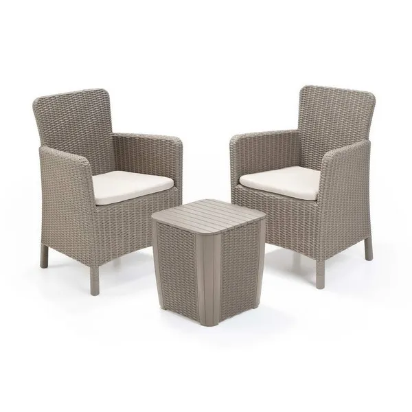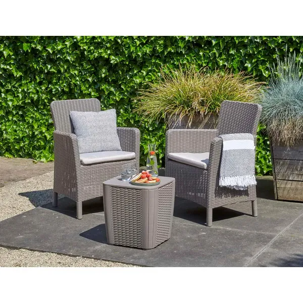 A Trenton Balcony egy lekerekített, rattan hatású stílussal rendelkező erkélyszett, amely két karosszéket és egy 2 funkciós, különböző kerti tárgyak és kiegészítők tárolására alkalmas Luzon asztalt tartalmaz. A megfelelő profilú üléstámlák és a puha párnák nagyon kellemessé teszik a szabadban töltött pihenés pillanatait. A könnyen tisztítható bútorszett tartós és ellenáll a kedvezőtlen időjárási körülményeknek, valamint az UV-sugaraknak. Klasszikus színekben kapható, összeszerelése nagyon egyszerű, nem igényel speciális szerszámokat.