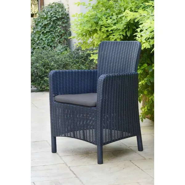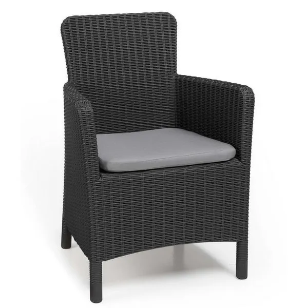 A modern Trenton fotel egyedi esztétikai megoldásokkal és funkcionális értékekkel rendelkezik: profilozott, lekerekített háttámlával és karfákkal, valamint kényelmes párnákkal kapható, amelyek komfortossá teszik a kerti, vagy a teraszon való pihenést. A termék még a legigényesebb vásárlókat is lenyűgözi a formatervezésével. A hagyományos fotel tökéletes alternatívája, stílusa a fonott rattanra emlékeztet. A gyártáshoz felhasznált magas minőségű műanyagnak köszönhetően ellenáll az időjárás viszontagságainak és az UV sugárzásnak is.