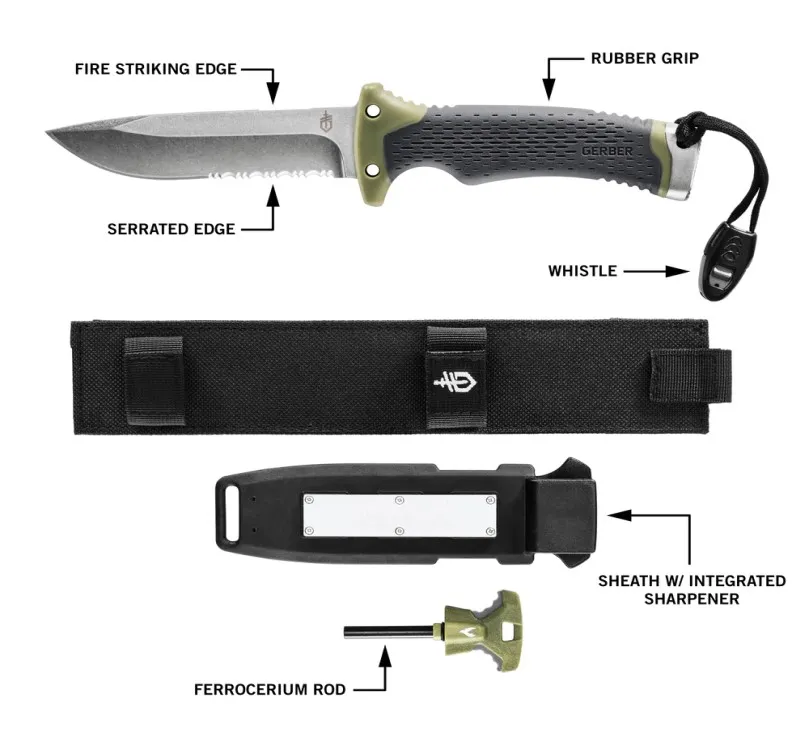 Félig fogazott magas széntartalmú acél tõr, ergonomikus gumi markolat,a markolatvég kalapácsként használható, vészjelsíp a csuklópánt zsinóron,Tûzgyújtó a tokban , gyújtóhorony a penge hátán kiképezve,Gyémánt felületû élezõ a tokban. A penge hossza:4,8 t