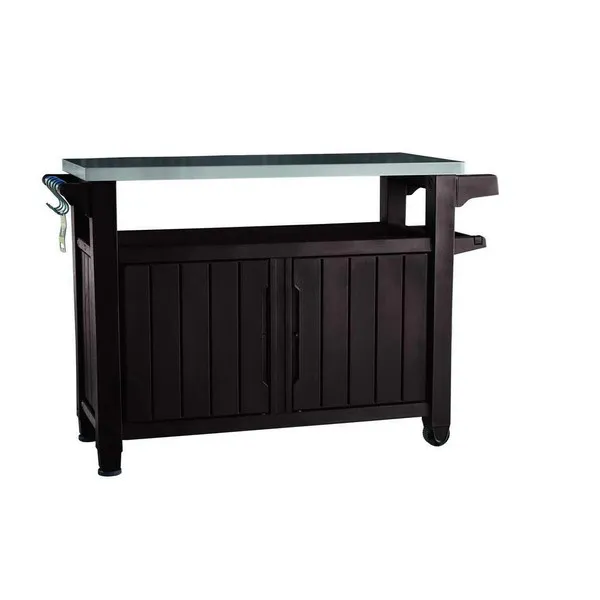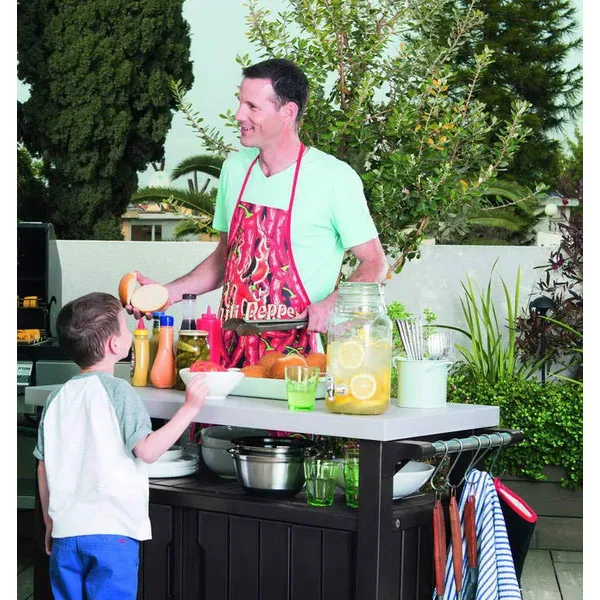 A 183L kapacitású Unity XL egy modern, hordozható tároló speciális feladatokra! A tágas kétajtós szekrény a rozsdamentes acélból készült munkalappal és akasztókkal felszerelt kényelmes fogantyúkkal remek választás a teraszon vagy kertben rendezett nagy családi összejövetelekre. Kényelmesen elférnek benne az edények, ételek és italok, valamint az egyéb, grillparty-k során elengedhetetlen konyhai felszerelések is.