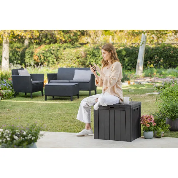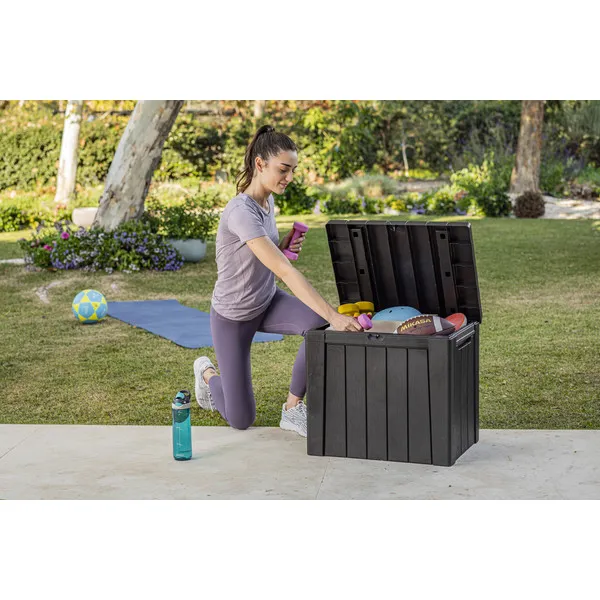 A 113 L űrtartalmú láda az elegáns külsőt vegyíti praktikus jellemzőkkel. Letisztult formája és a természetes fát imitáló külseje azt eredményezi, hogy tökéletesen passzol minden kertbe, teraszra. A többfunkciós láda tartalék bútorként is szolgálhat egy nyári kertiparty során, egy felnőtt ember súlyát is gond nélkül elbírja. Az Urban kerti tároló láda olyan anyagból készült, amely ellenáll az UV sugárzásnak, így eredeti kinézetét sokáig megtarthatja az időjárás viszontagságai, valamint az erős napsugárzás ellenére is. A karbantartás roppant egyszerű – a ládát elég egyszerűen, egy nedves rongy segítségével letörölni.