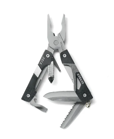 Kis helyigényû, kulcstartóra rögzíthetõ, könnyû és erõs kombinált szerszám rozsdamentes acélból, galvanizált markolattal. Tartalma: közepes, lapos fejû csavarhúzó; reszelõ Philips csavarhúzóval; sima élû penge; fogazott penge; kis laposfejû csavarhúzó; üvegnyitó; drótvágó, valamint rugós hegyes fogó. Teljes (nyitott) hossza: 10,1 cm, hossza zárt állapotban: 6,1 cm. Szélessége nyitott állapotban: 8,9 cm, zárt állapotban: 2,5 cm. A penge hossza: 3,8 cm. Súlya: 56,7 g. (2231000021)